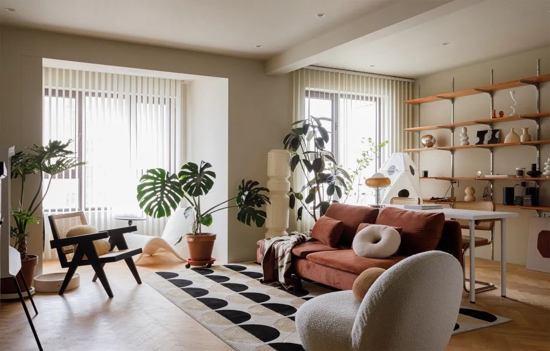 沙发背面是开放式书房,后疫情时代免不了要经常居家办公,敞亮舒适的书房很有幸福感。