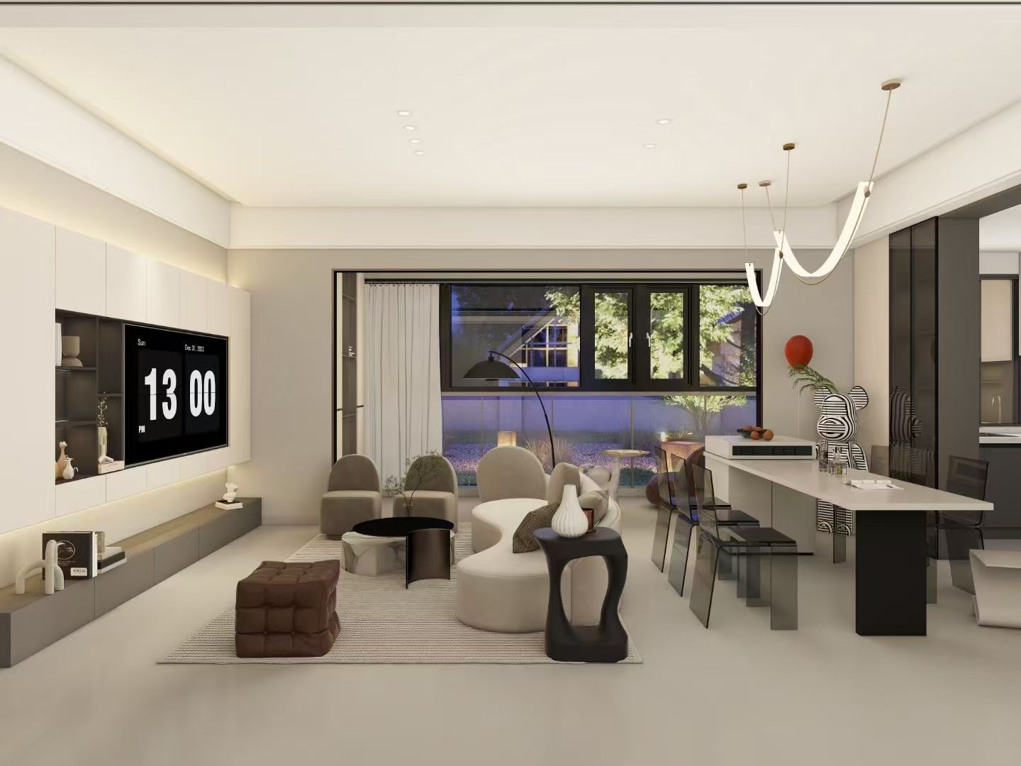 现代简约开阔风,客餐厅连通增强空间互动,异形沙发、创意小凳等家具打破常规,无主灯设计+简洁电视柜,大窗引入自然景,塑造个性休闲场域。