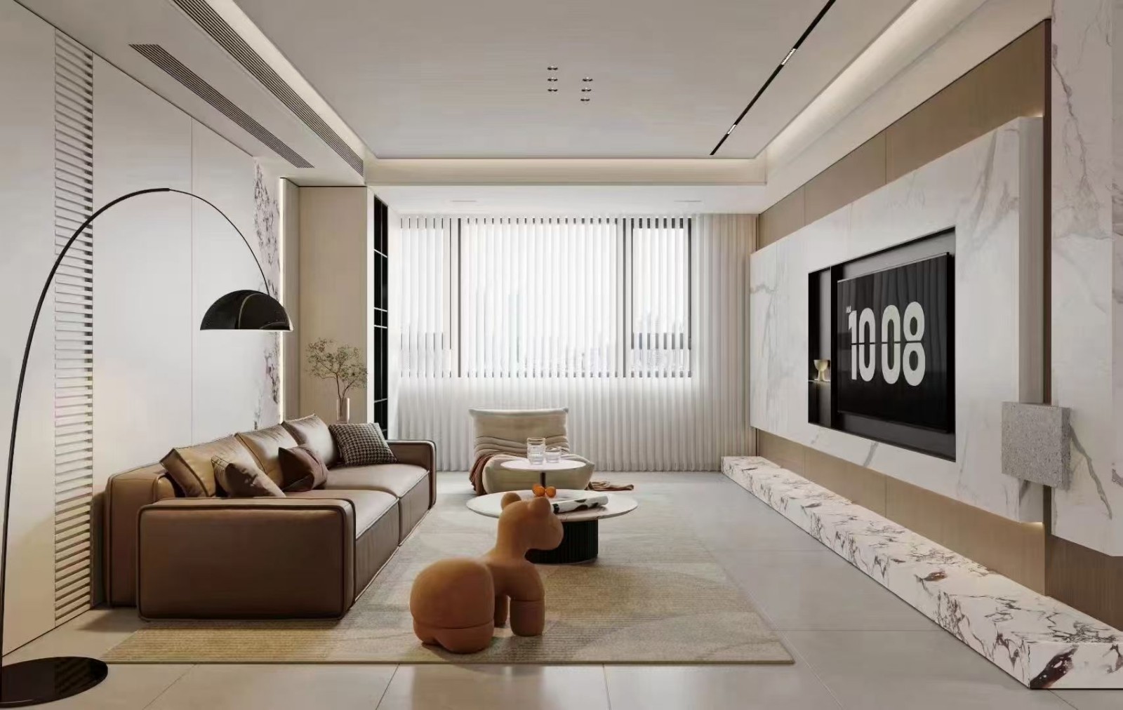 现代简约风,悬浮式电视柜与背景墙一体化设计,嵌入艺术装置增添视觉层次。无主灯搭配落地灯,营造开阔且具时尚感的交流空间,异形家具点缀显独特。