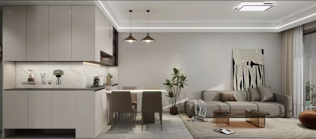 客餐厅,整体以浅色调为主。厨房区域橱柜简洁,餐厅有桌椅和吊灯,客厅摆放着沙发、茶几,墙上挂着装饰画,还点缀着绿植,空间明亮舒适