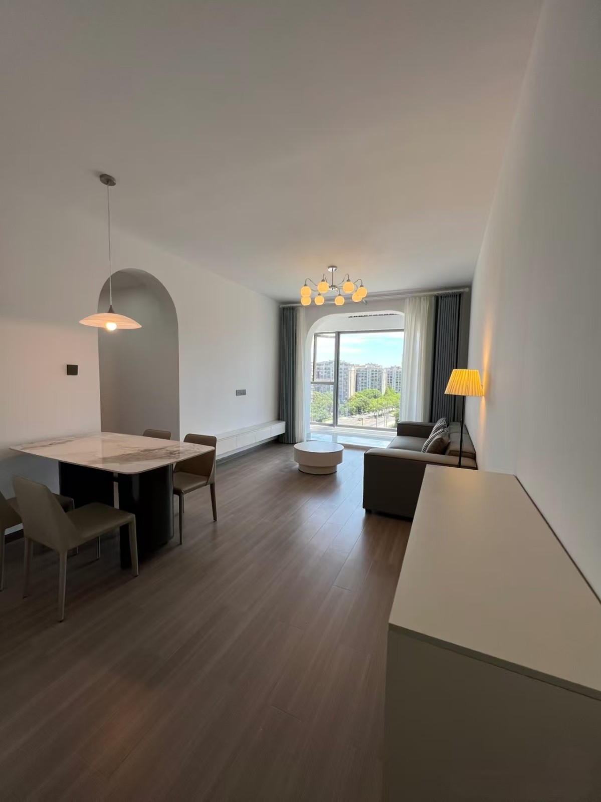 整体以白色为主色调,搭配浅木色地板,营造出明亮通透且温馨的氛围;家具线条简洁利落,灯光设计巧妙,吊灯台灯的造型简约又不是精致感,为空间增添了柔和的光影效果