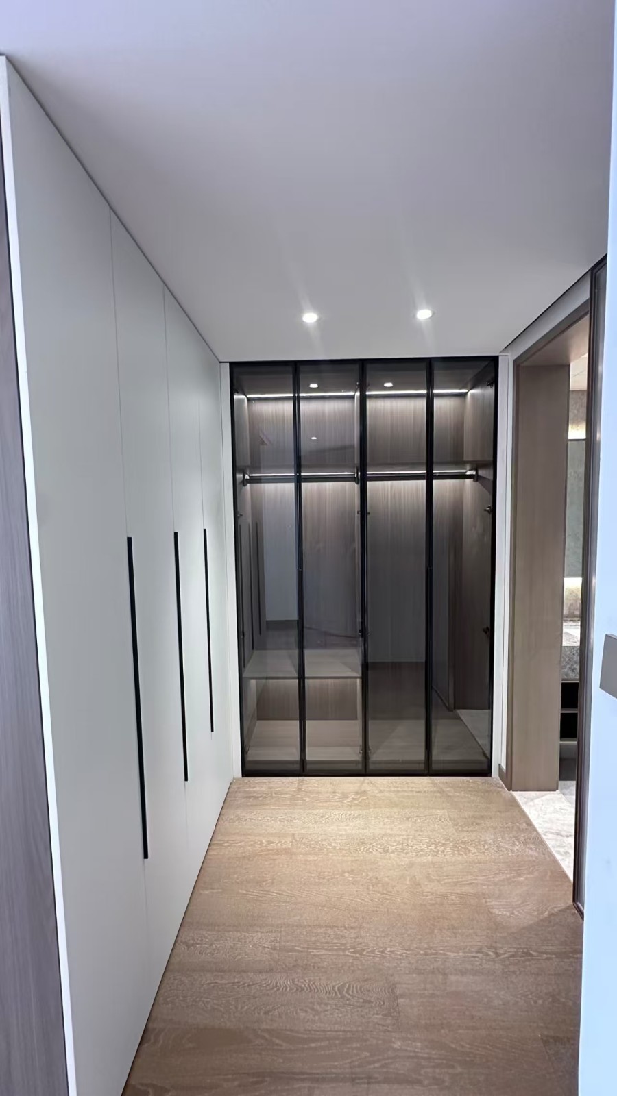 步入式的衣帽间,柜体表面平整光滑,质感良好,拉手设计简约设计,玻璃柜门通透,搭配黑色边框,尽显时尚与***