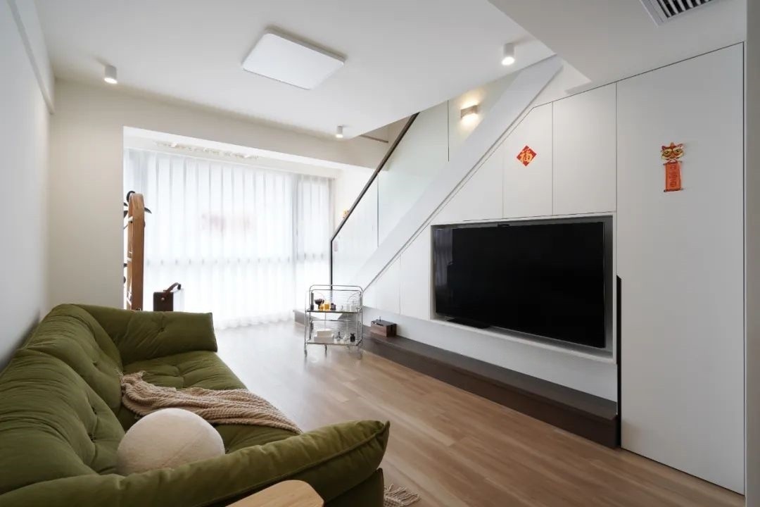 直排楼梯结合电视柜的设计,让阁楼的楼梯入口在阳台,空间更自由宽裕。