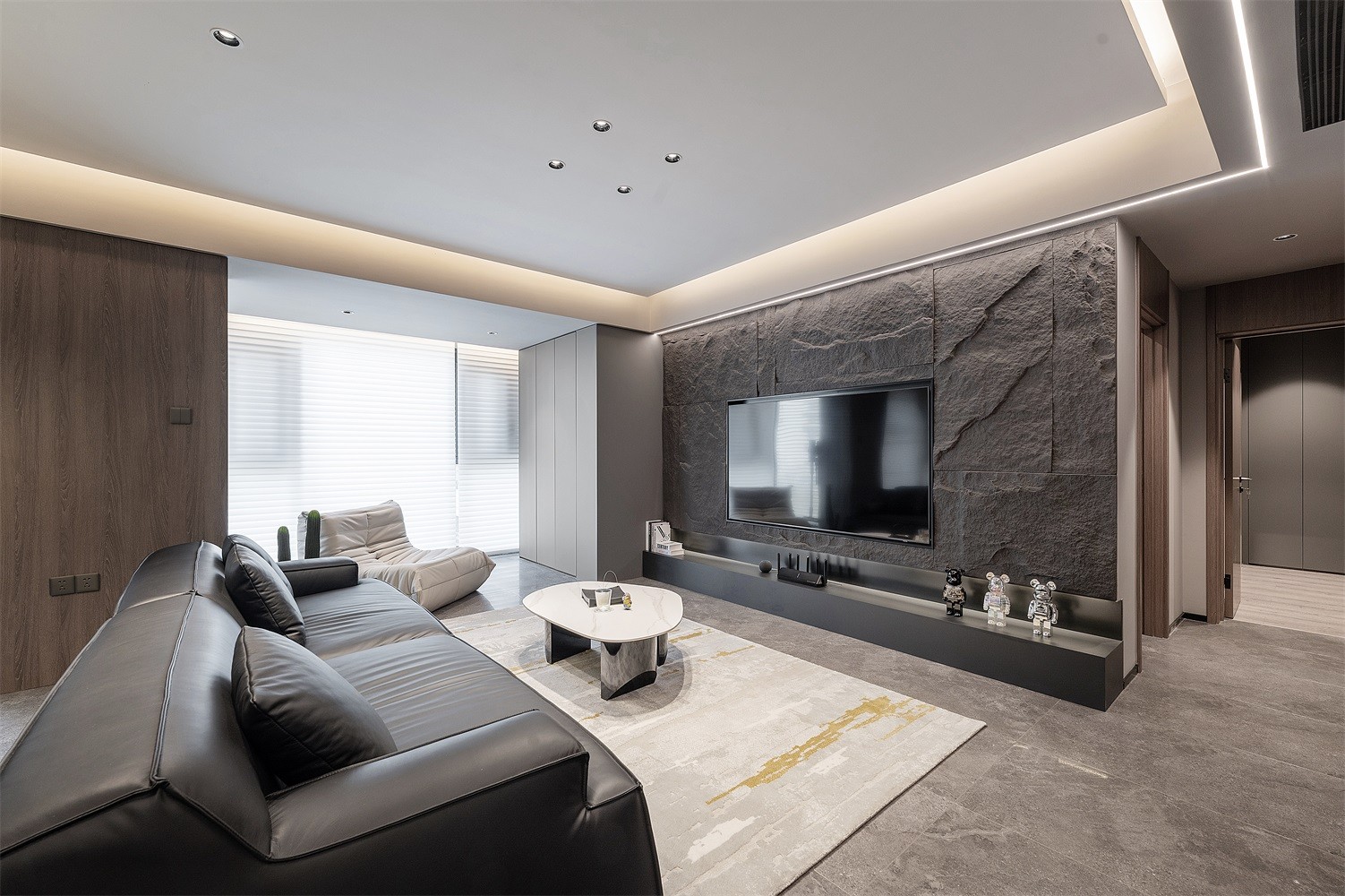 电视背景墙不仅做了流行的悬浮式+地台的造型,还大胆选用了独特的蘑菇石上墙,石材的冷冽和粗犷融入家居生活,在射灯点染下,展现出艺术品般的质感。 电视墙侧边衔接做了一组到顶的储物柜,***灰的木饰面与墙面色彩契合,搭配无把手的简约设计,维持立面整洁。