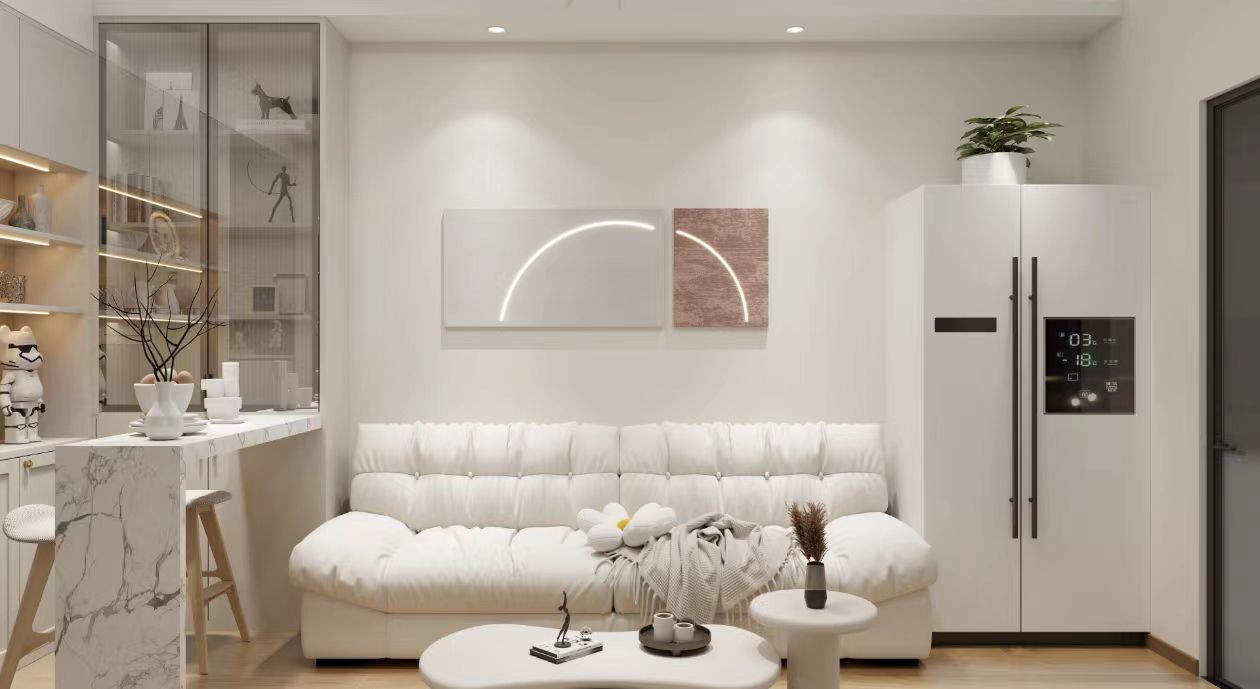 客厅,整体以白色为主色调。有白色的沙发、茶几,墙上挂着带弧形灯光的装饰画,一侧是带玻璃门的展示柜,摆放着各种摆件,旁边还有白色双开门冰箱,营造出简洁明亮的氛围。