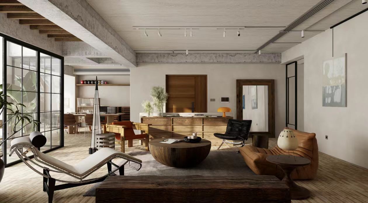 这是一间工业风与自然元素结合的客厅,裸露的水泥天花板搭配木质结构,大玻璃窗引入充足光线。摆放着多样座椅、圆形木茶几,还有绿植、艺术装饰,整体氛围舒适且富有设计感。
