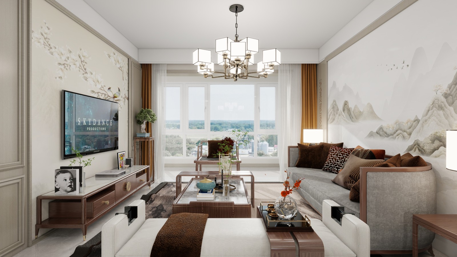 对称式布局,简洁明快,背景墙采用水墨画元素,搭配中式家具,展示东方韵味