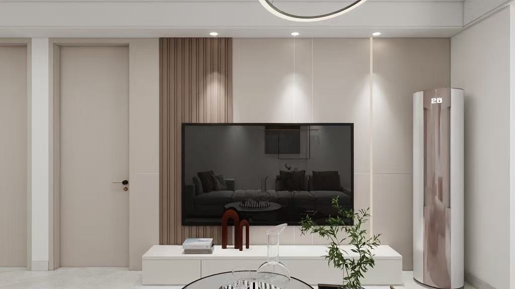 这是一套两居室,整体现代简约风格,客户需求:拆除客厅阳台垭口,扩大客厅空间,客厅做了边吊+筒灯的造型,电视墙做了格栅+墙板的造型,通铺600×1200大地砖。