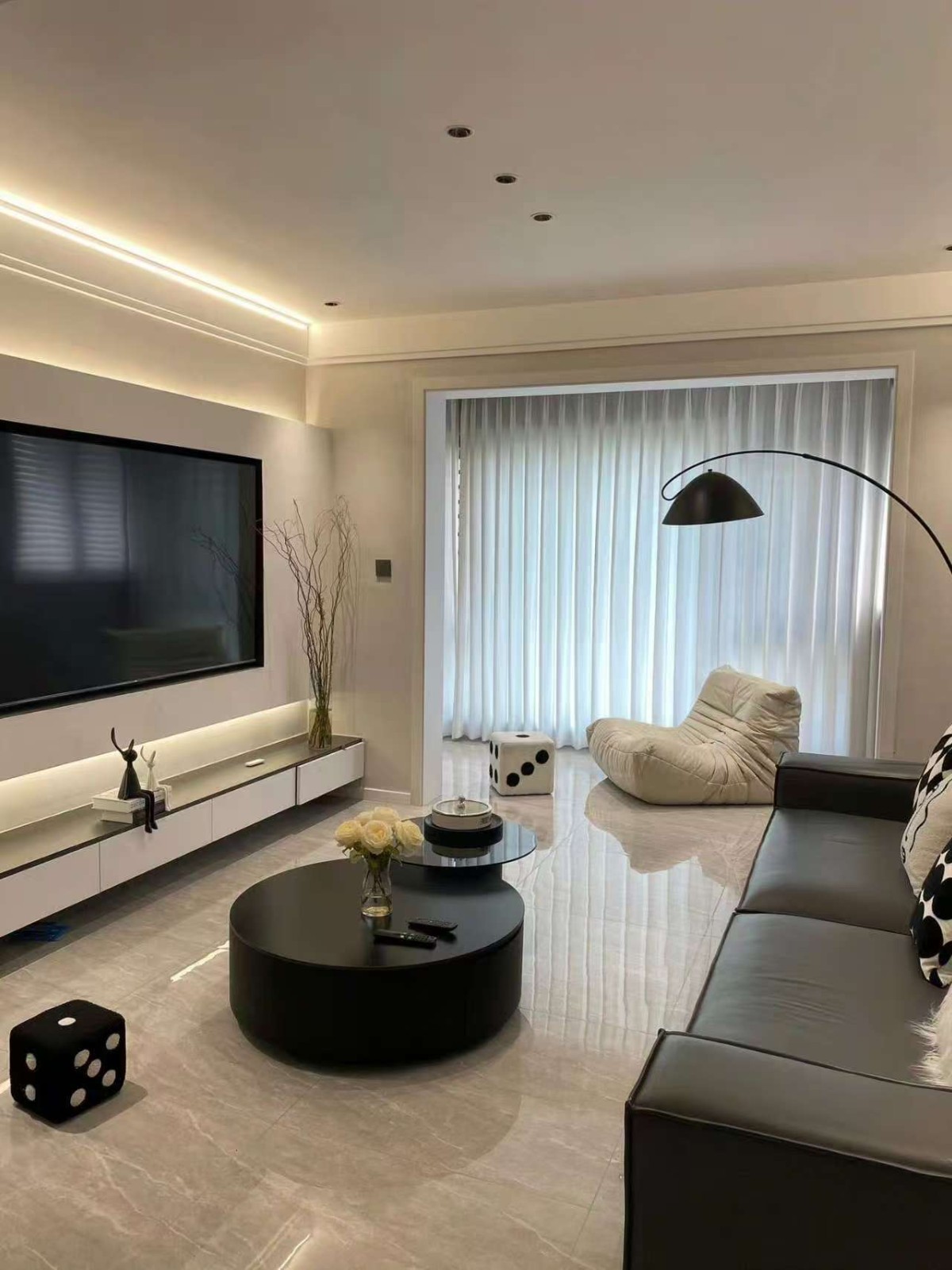 这是一套三居室,整体风格为现代简约风格,双眼皮石膏线内嵌灯带,背景墙采用石膏板造型内嵌灯带,800*800地砖整体搭配让人舒适。