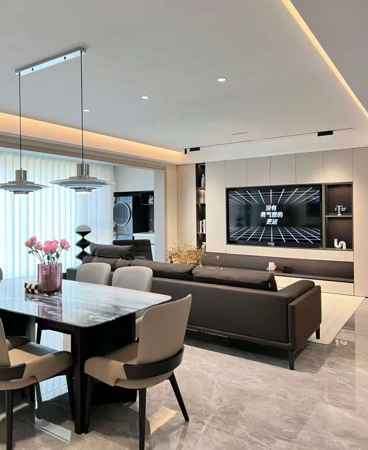 这是一套138平米 四局两卫现代轻奢风格案例 满墙的电视柜储存收纳空间增多 阳台窗户更换为80系统三层钢化玻璃密封性很好 卧室采用定制柜做假墙储存收纳多一些 厨房L型洗切炒动线合理,上下门板同色系 更加美观