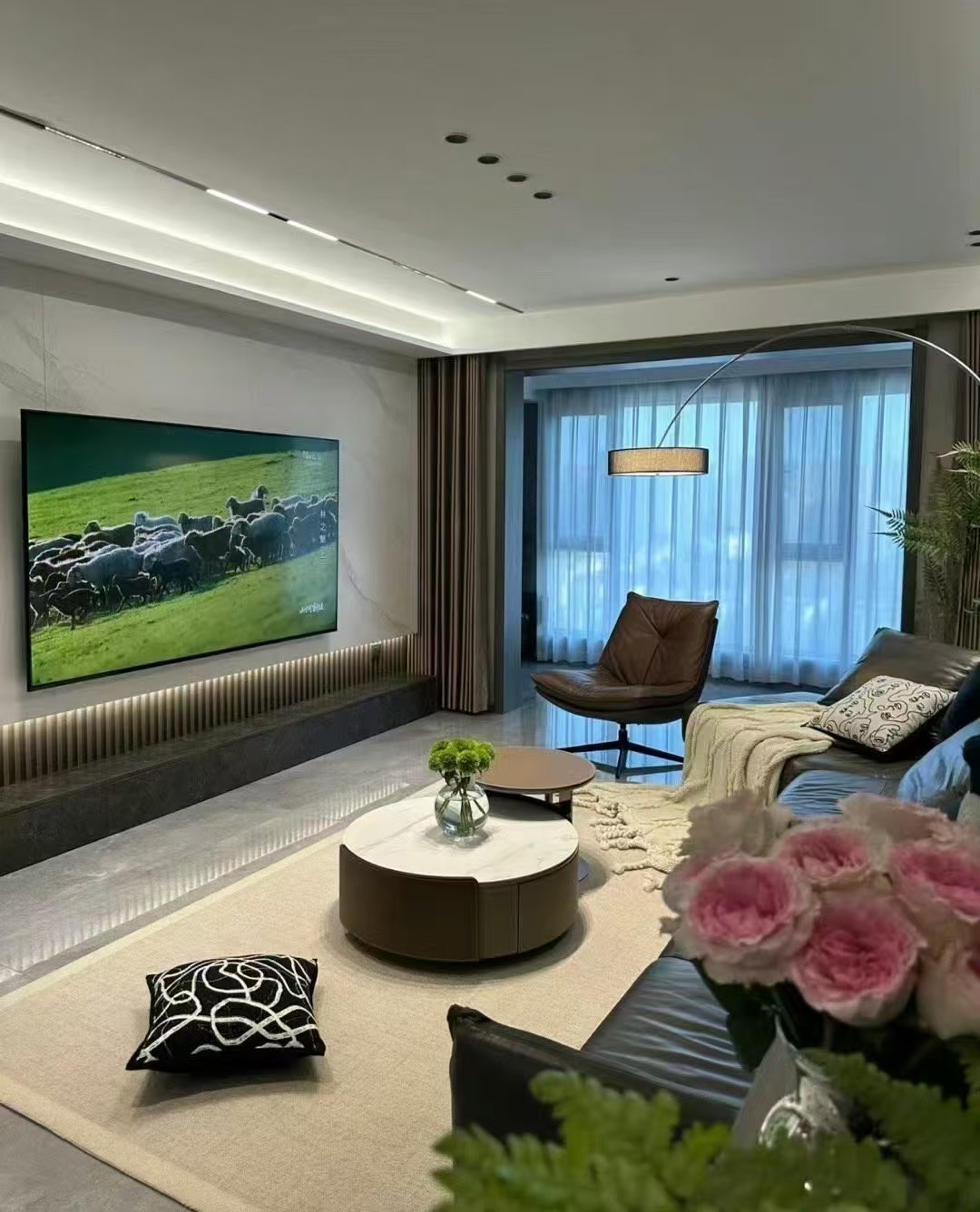 客户垭口、窗帘、电视柜采用都是黑色系列 电视背景墙采用格栅打底 +木饰面岩板上内嵌灯槽灯带显得***感满满