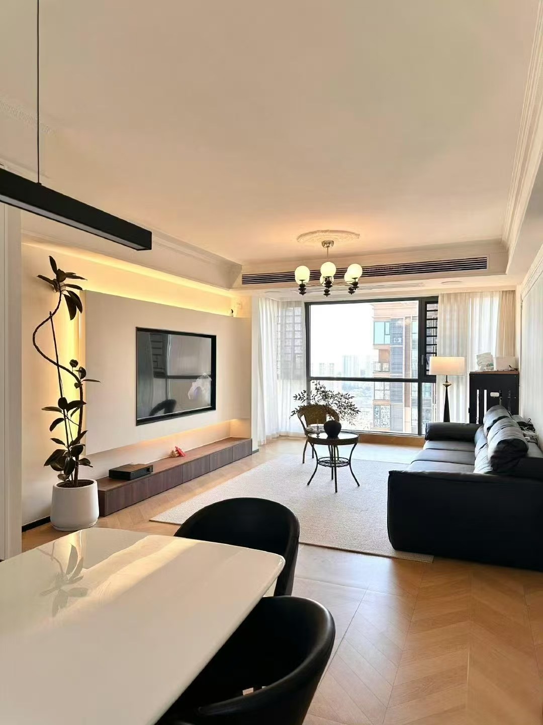 这是英国宫一期老房翻新婚房混搭法式案例 石膏板背景墙内嵌灯槽灯带发光显得氛围感十足 顶面采用法式灯盘 沙发背景墙细节处理上运用了法式雕花、线条,高贵典雅。
