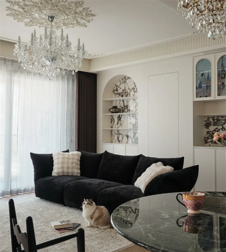 空间整体以黑白为主色调,精致的雕花灯盘和水晶吊灯搭配,散发出法式独有的***感。宝格丽石材以其天然的肌理与冷峻的光泽成为视觉焦点