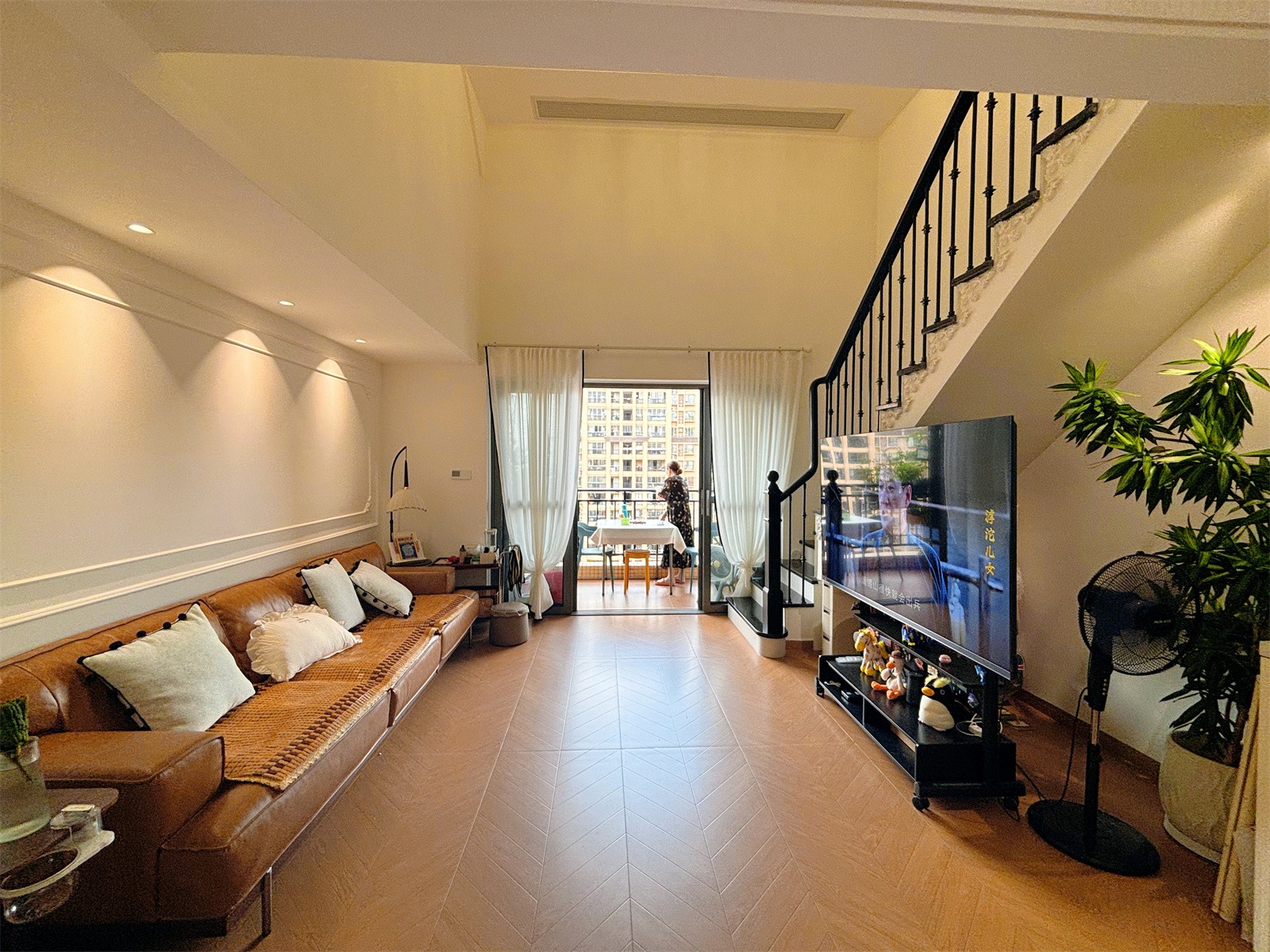 黑色铁艺楼梯线条利落,与法式的浪漫感巧妙融合,兼具实用性与装饰性。通透明亮的落地窗引入充足自然光线,让整个客厅更显开阔通透,整体营造出既保留法式浪漫情调,又贴合现代生活舒适实用需求的居住氛围。
