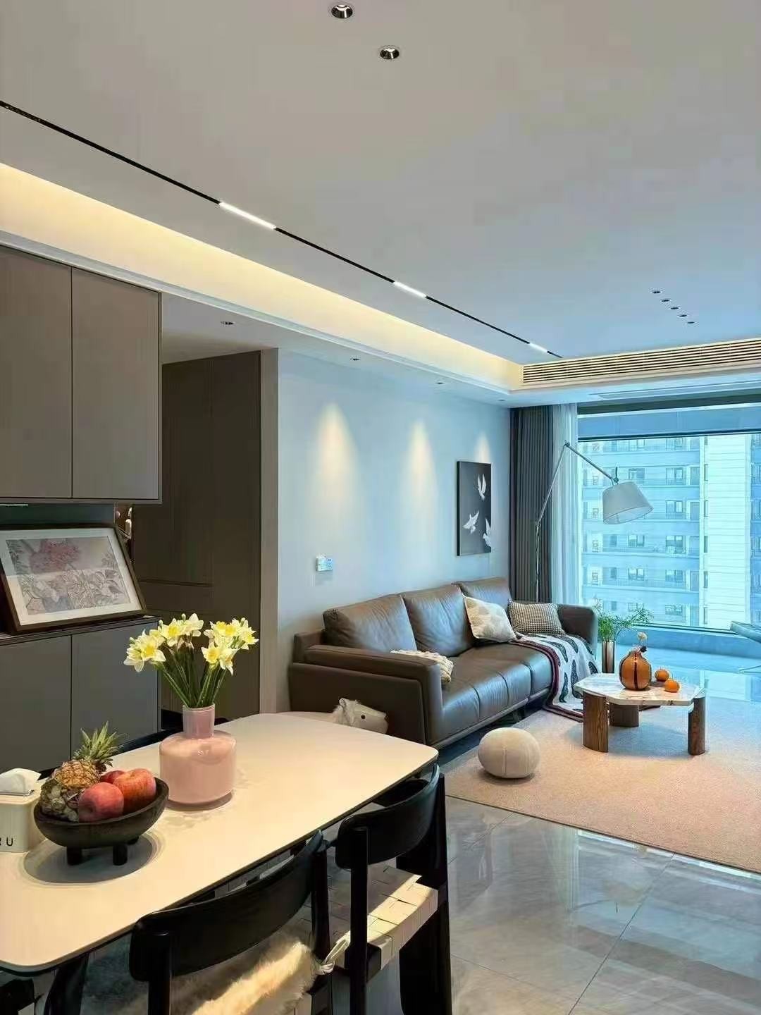 舍弃传统电视墙,以书柜为视觉中心;打通阳台增设茶台区,结合羊羔绒坐垫和新中式茶台,打造休憩角落1。 延伸设计:黑色小边几保持空间轻盈,抽象艺术