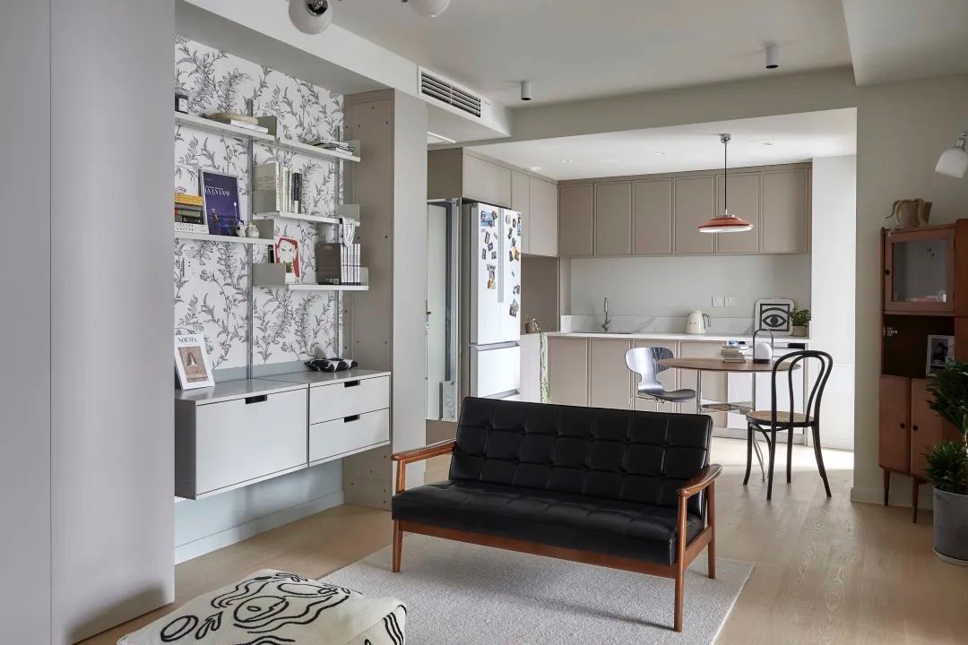 传统观念中,客厅会有一个电视背景墙作为视觉焦点和收纳重点,这个家完全打破了这个设计手法。 成为视觉和收纳重点的是墙上的置物架,白色清爽又显得通透,兼顾美观实用。