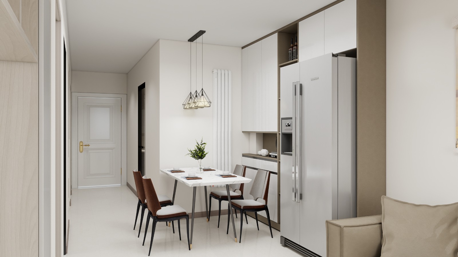 此空间设计紧凑实用,餐厅与厨房区域相连,方便用餐与备餐。餐桌搭配几把椅子,适合日常家庭用餐或朋友小聚。色彩以白色为主调,点缀浅棕,简洁明亮。整体是现代简约风格,家电嵌入橱柜,既节省空间又显整洁,营造出舒适便捷的居家氛围。