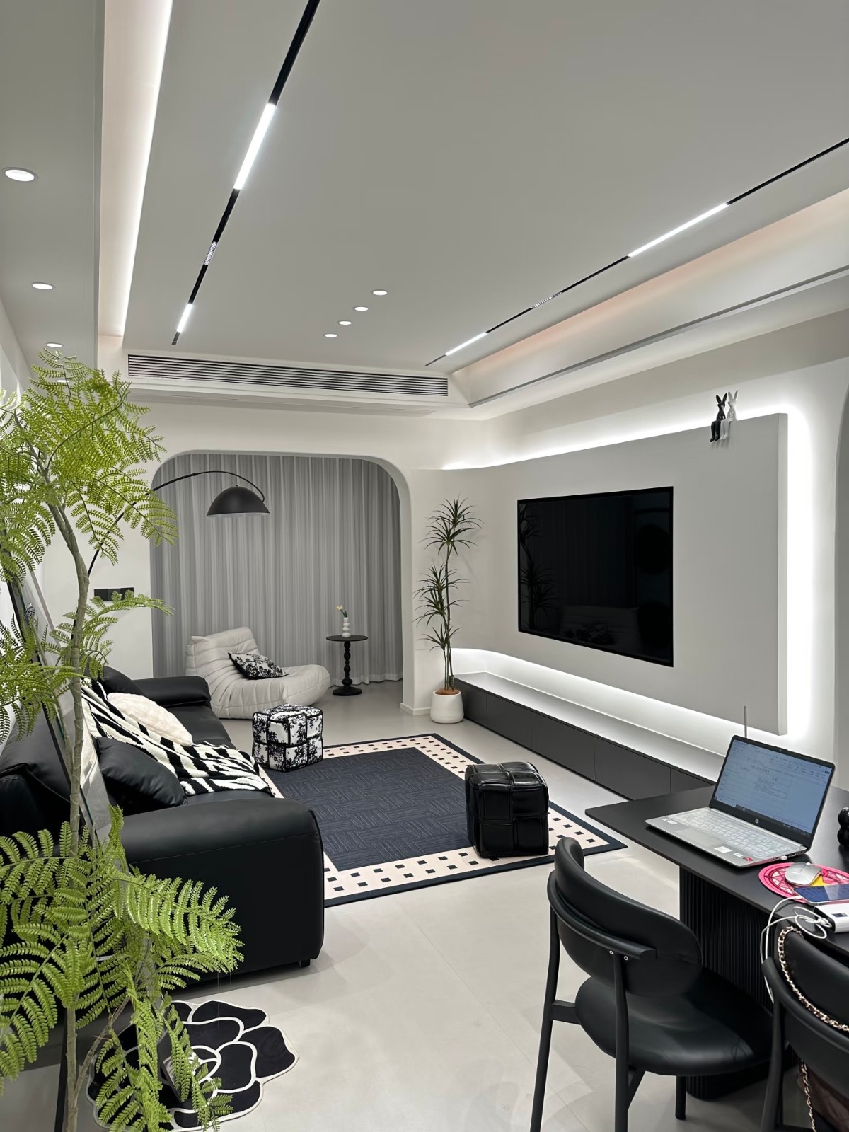 以黑白灰为主色调。客厅安装了无主灯,线条灯带和筒灯结合,营造出简洁而有氛围感的照明效果。