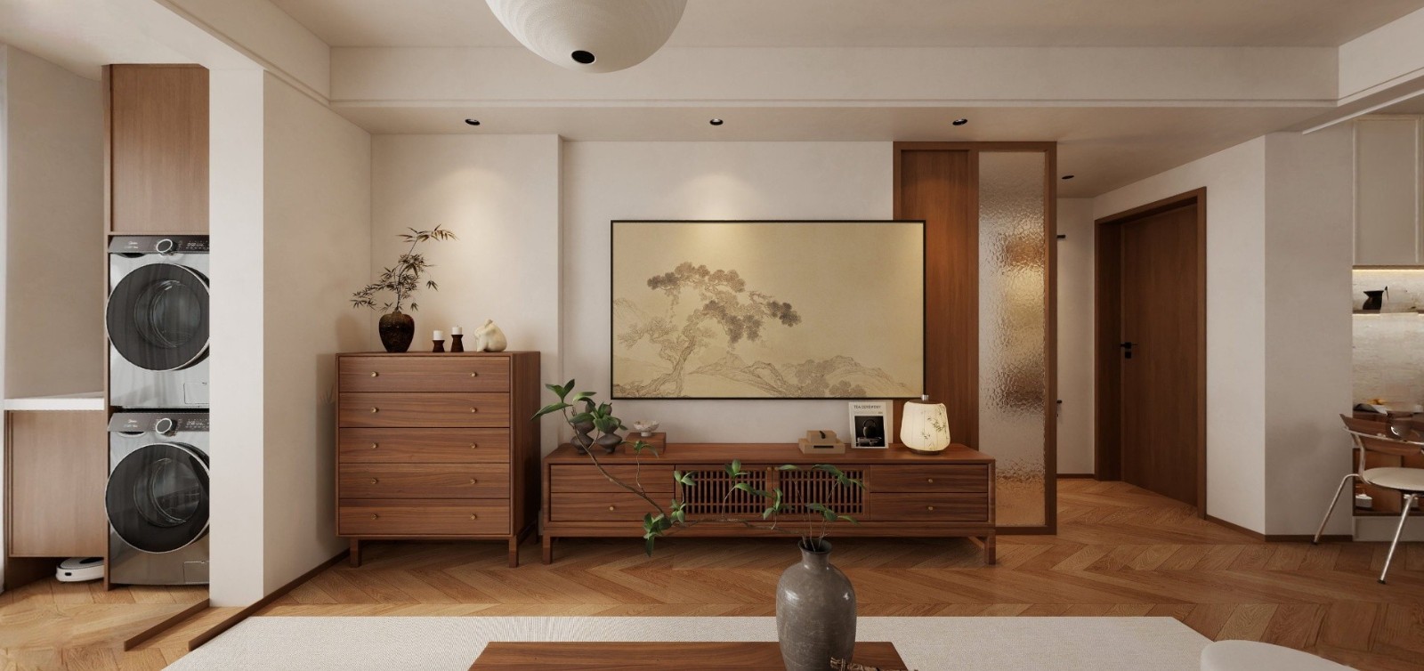 地面通铺浅橡木***字拼地板,温润而有秩序感。