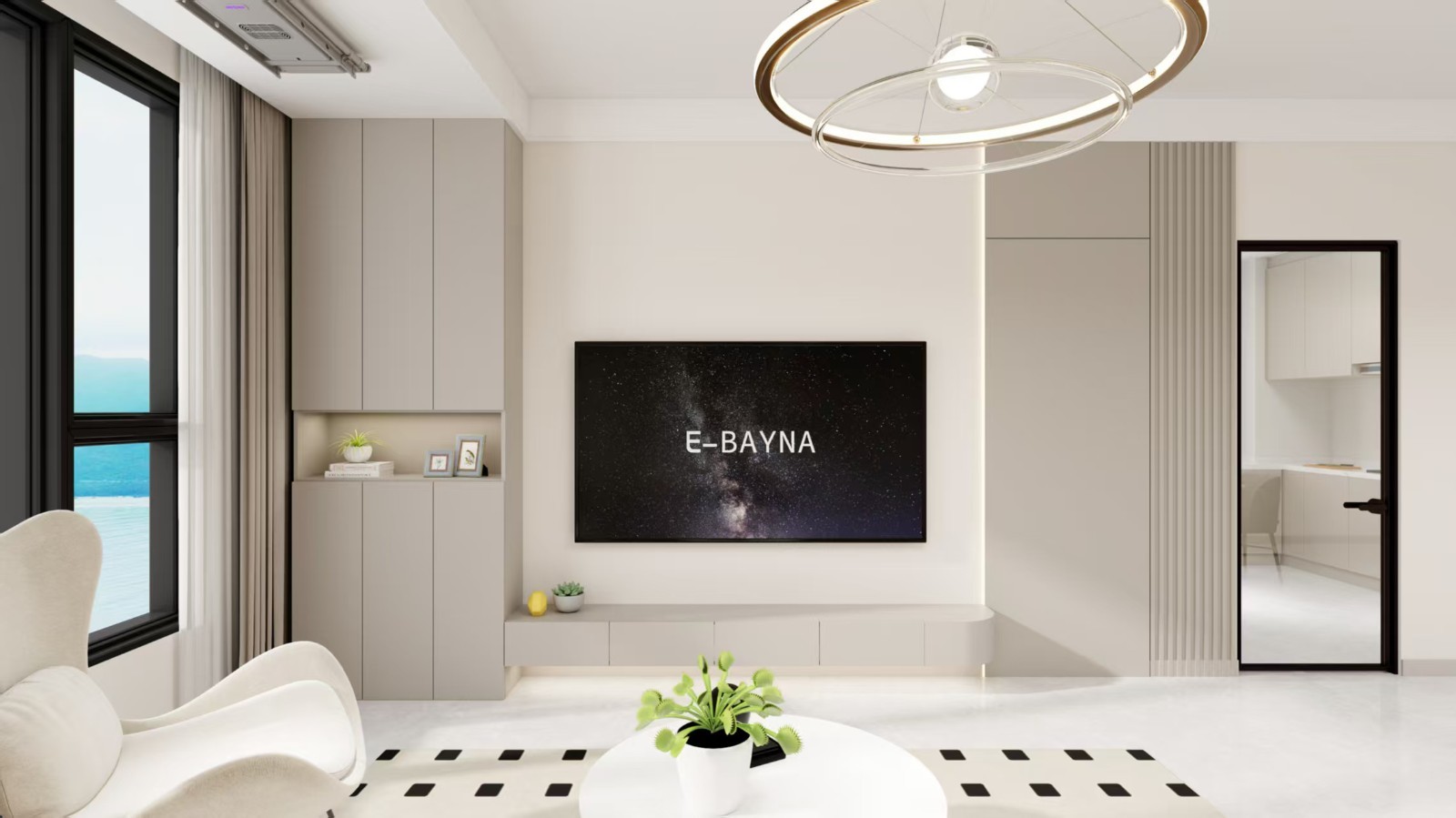 以浅米色为主色调,米白色沙发搭配橙色抱枕,增添活力。电视墙设计简约,嵌入式电视与灯带结合,旁边的收纳柜兼具储物与展示功能,玻璃门设计让空间更显通透,整体营造出温馨舒适的休闲氛围。