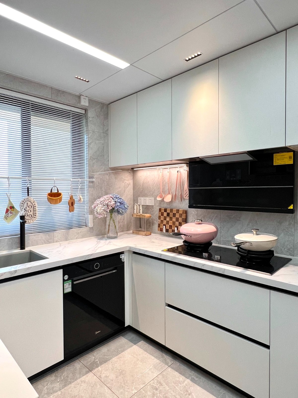 在厨房的设计上,我们做了一组L形橱柜,洗切炒动线合理,在门后的位置也做了一组橱柜,炒好菜的放置区也有了,而且也增加了储物空间,另一端橱柜直接延长至阳台做成了一体式橱柜,一体连接性更好了。地面墙面用的是同***瓷砖直接上墙,橡木地柜配上白色吊柜,让地面到顶面的颜色跨越有个过渡,无把手的设计让整体空间看起来更加整洁,干净了