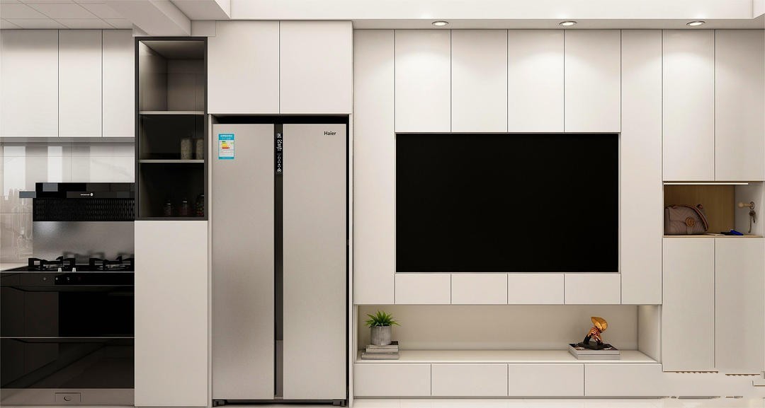 电视背景这块结合了鞋柜 电视柜一体化设计增加收纳空间,冰箱烤箱也融合了进去。