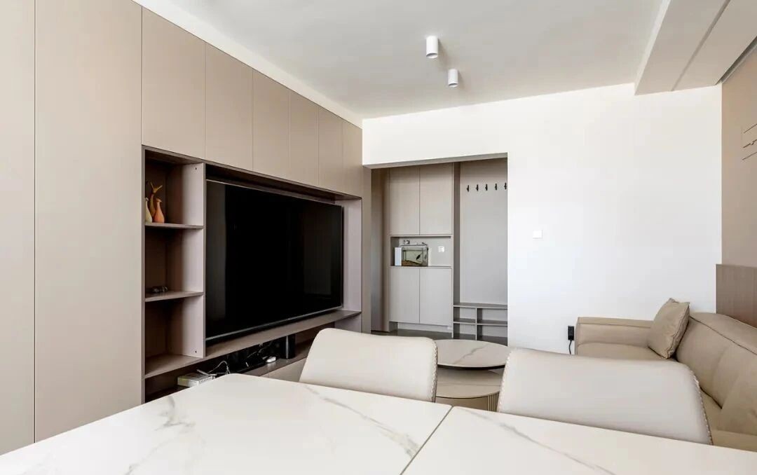 总长5米的电视墙,采用无把手柜门设计,简约精致,减少阻碍。中间搭配开放格,有藏有露,不显拥挤。内嵌的暖黄灯带,温柔地晕染出一抹温馨氛围。