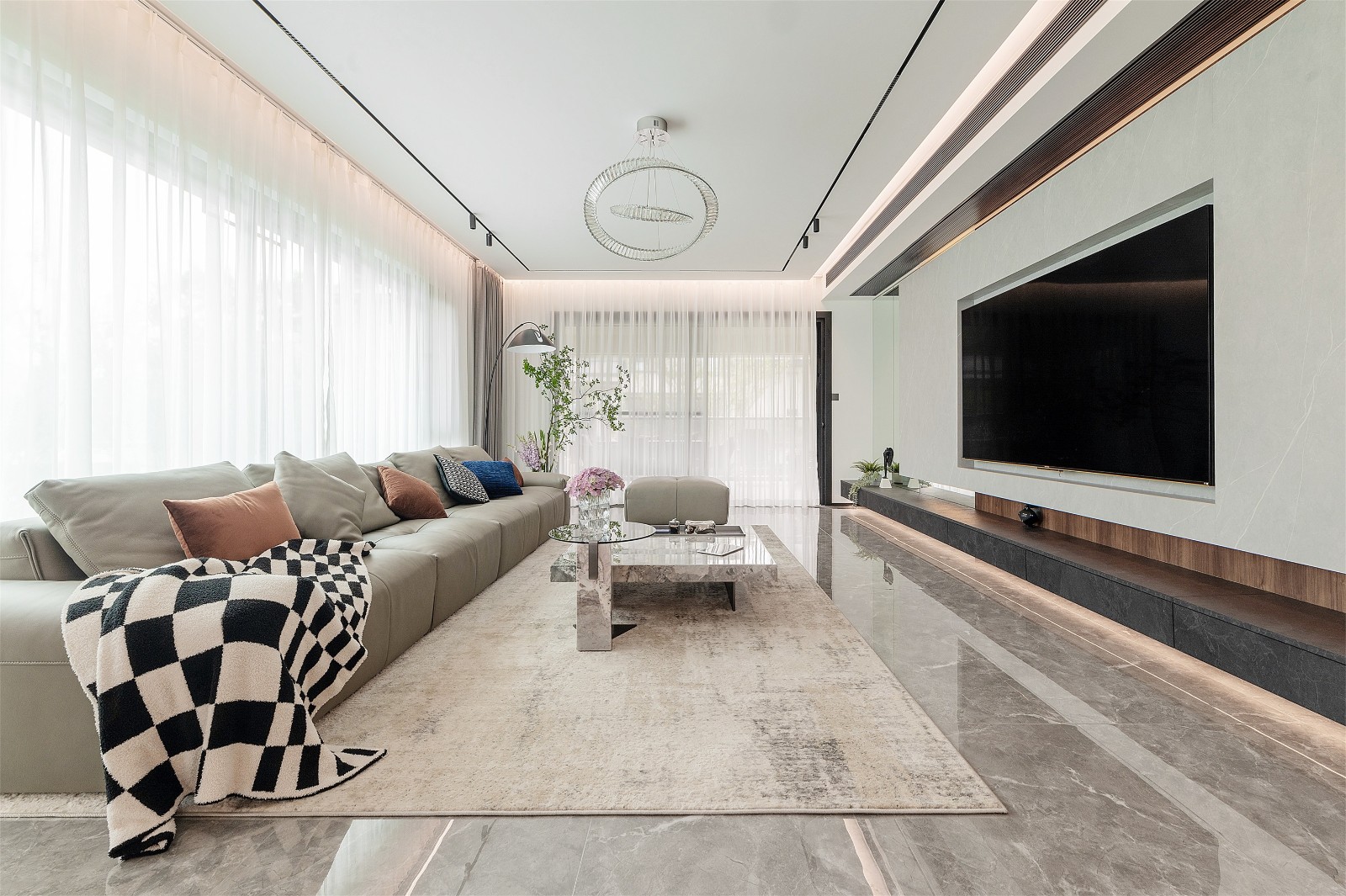 客厅以整面落地窗引入充沛光线,空间更显开阔气派。全屋以灰色为基调,奠定沉稳耐看的底色,结合黑、白***系,将现代风格的标志性配色运用得淋漓尽致,塑造出高端住宅的质感。 地面通铺灰色亮光砖,呼应整体色调。吊顶采用悬浮式设计,搭配黑色轨道灯勾勒线条,强化了空间的立体感与现代气息。