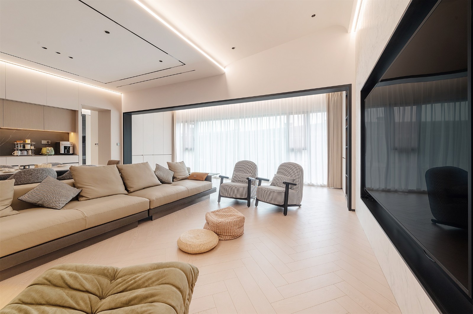 这是一套横厅户型,客餐厅连接大阳台。打通后以落地窗封窗,极大提升了公共区域的开阔感。阳台一侧定制储物柜,在保留视野的同时兼顾实用收纳。地面选用浅色仿木纹地板,轻松烘托出温柔放松的氛围。