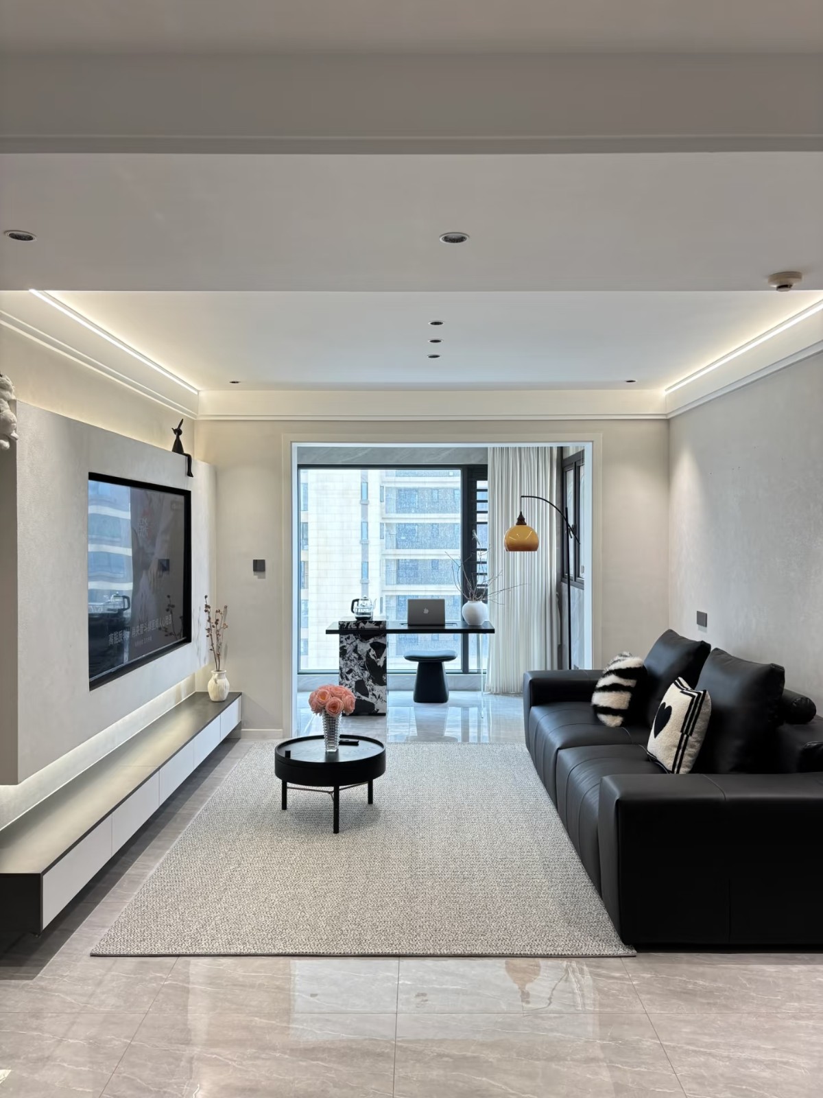 一进客厅,就被这简洁大气的布局吸引住了。无主灯设计搭配筒灯和灯带,光线柔和又有层次感,晚上氛围感直接拉满。