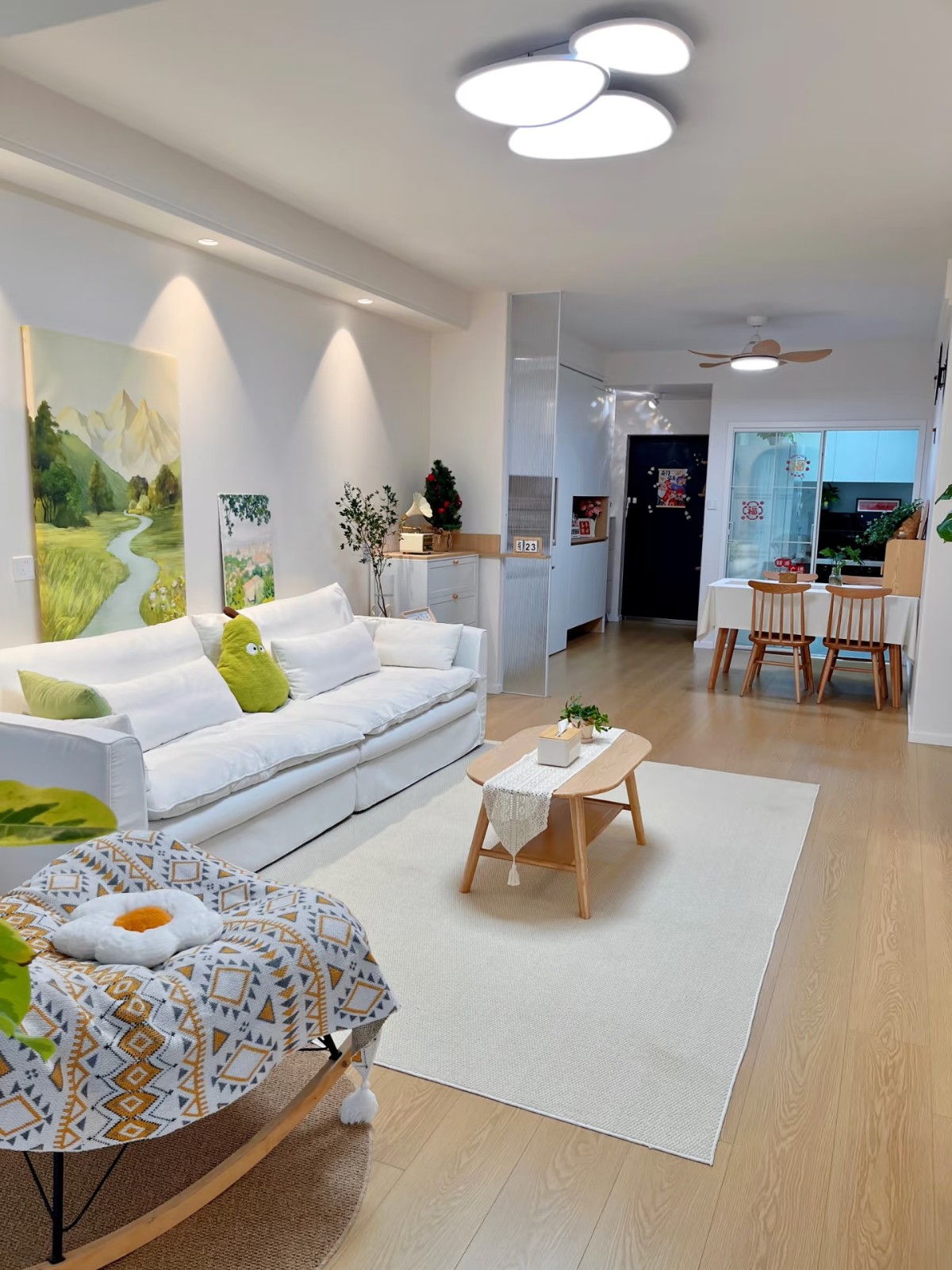 浅木色地板搭配白色柜体,弧形门洞柔化空间边界,绿植与暖光营造自然呼吸感。