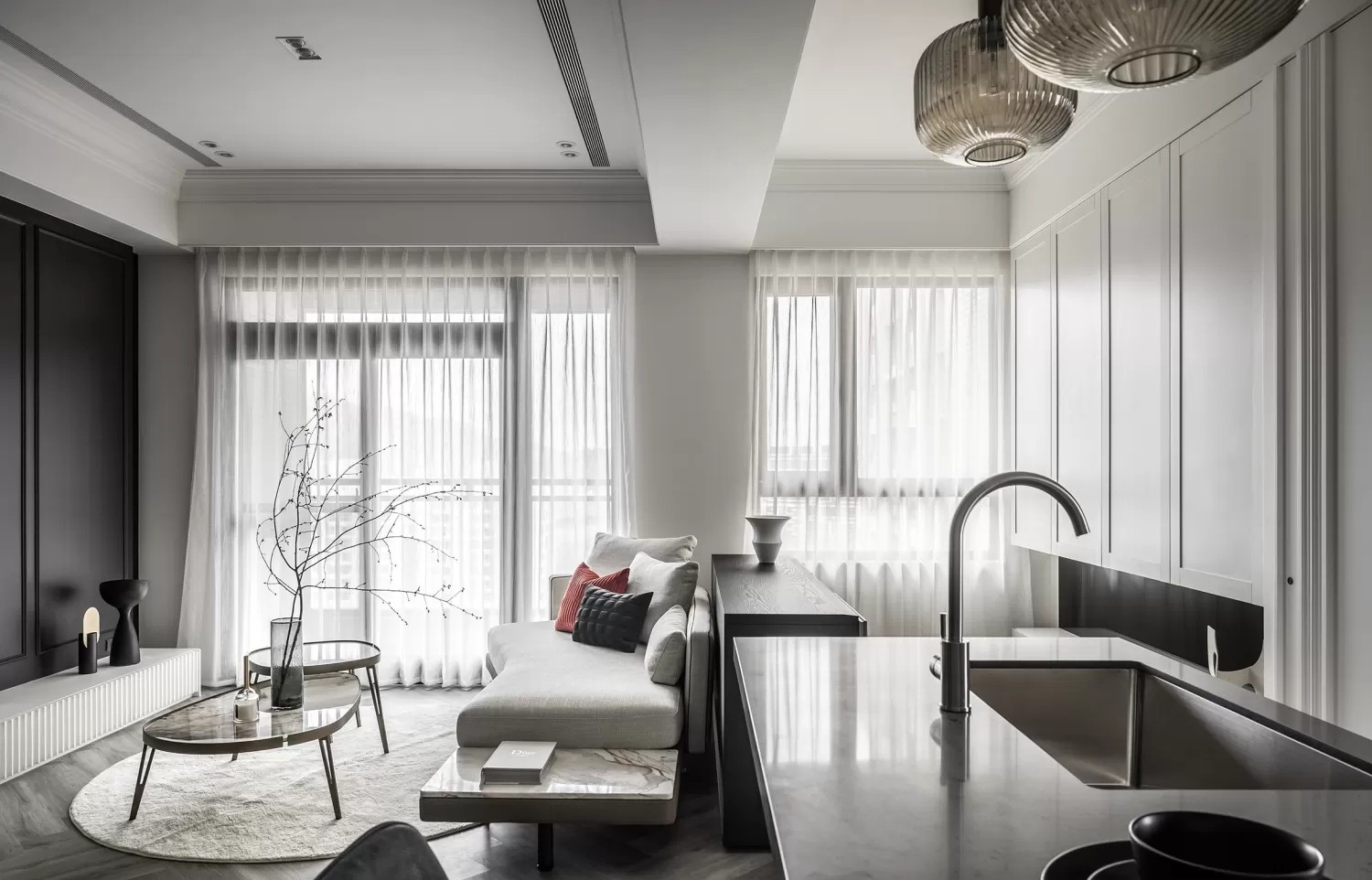 白柜+黑台面+水泥纹墙,基础色调干净利落;琥珀玻璃吊灯是灵魂,暖光一透,冷硬厨房瞬间温柔起来;墙面的金色挂钩、柜门的金属线条,把“轻奢感”揉进了细节里;连门都做了竖条格栅,和客餐厅的肌理元素呼应,风格统一得很巧妙。