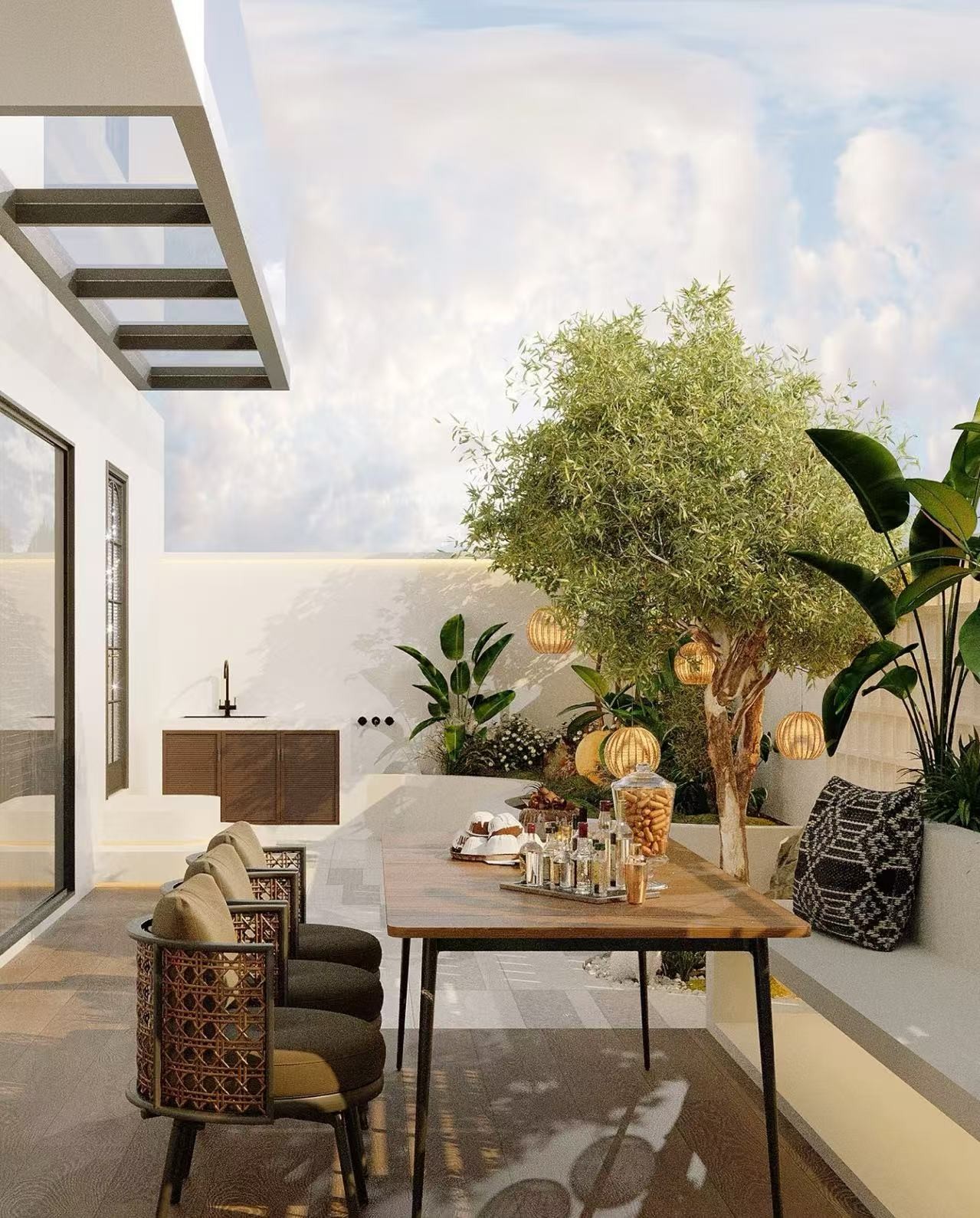 挂在橄榄树上的竹编灯笼灯、黑白纹理抱枕,柔化了空间线条;墙面嵌入式灯带+台面小设施(墙边的水槽+收纳柜),既保证夜晚温馨感,也兼顾了户外用水、储物的实用性。
