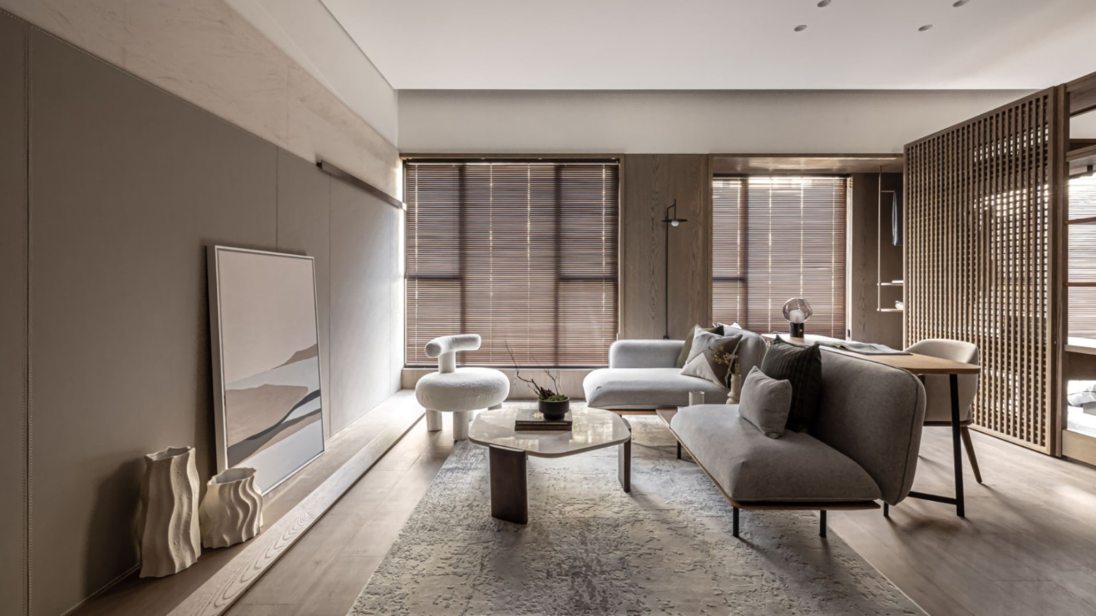 低饱和灰调软装+木质百叶窗,格栅隔断既通透又划分区域;软装线条柔和,自带松弛氛围感