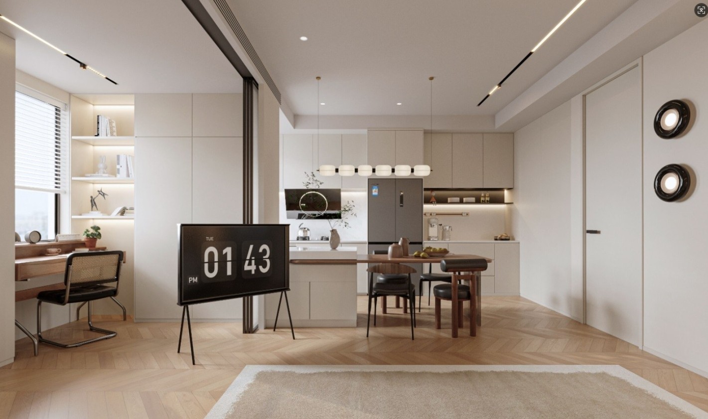 以低饱和度的暖色为主,颜色可以选可可奶白、菱花白、杏子灰、奶咖等颜色的乳胶漆,墙面和顶部通刷。