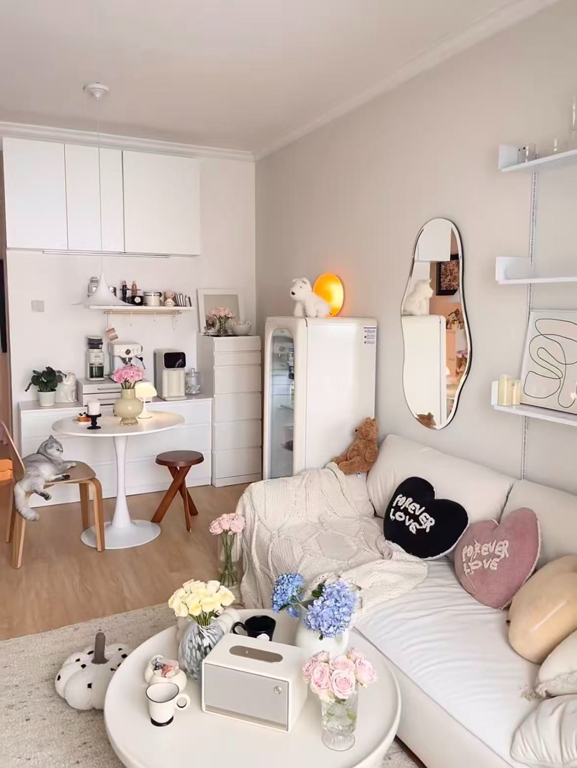 白色吊柜+壁挂置物架,把咖啡角、收纳区嵌在墙面,不占地面空间还很整洁。