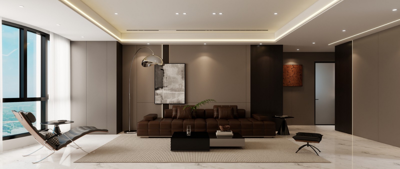 延续意式极简质感,深棕 + 灰色主调下,模块化真皮沙发大气沉稳,搭配造型休闲躺椅与双拼茶几,平衡功能与美学。弧形落地灯与艺术挂画增添艺术氛围,无主灯 + 线性灯带结合大落地窗采光,让空间通透有层次,打造出集社交、休闲于一体的高品质会客厅。
