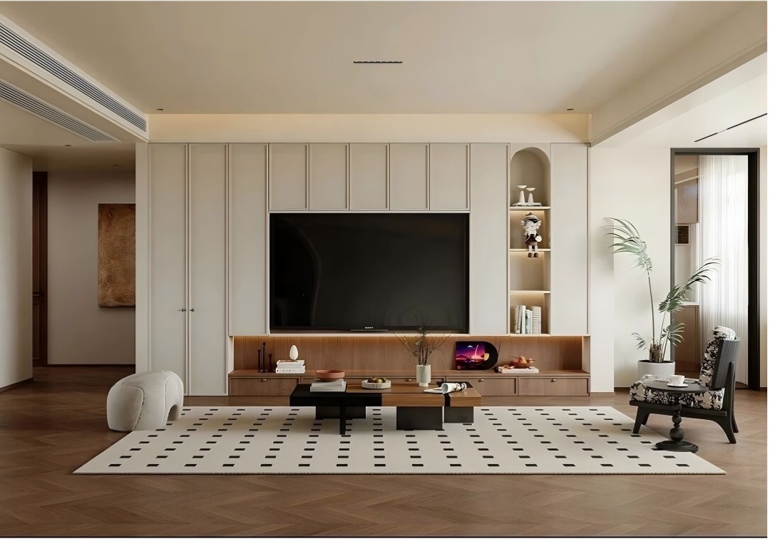 满墙接顶高柜将储物功能发挥到***。一门到顶的高柜与开放式置物格的组合,各类生活物品均可一一容纳,还居者一个整洁干净的休闲空间。.光影上,内嵌灯与自然光交织,让柜体的利落线条和复古细节在柔和氛围里更显温润,既适配家庭互动,也保留了独处的松弛感。