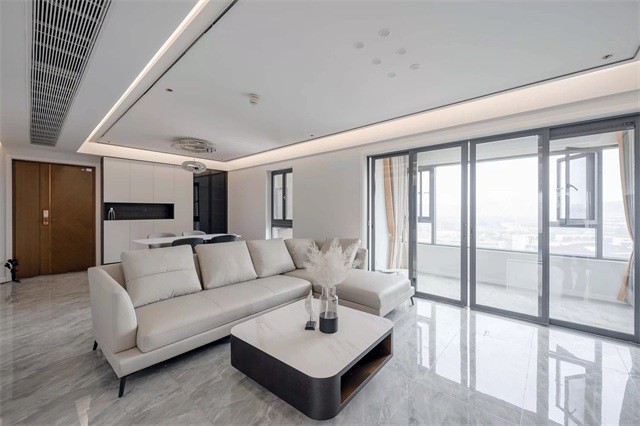 首先我们来看客厅,***眼看到整个公区就能真正的体会到什么才叫极简风。 设计师在墙地面全部采用了纯粹的白色填充空间,虽然简单,但一点都不简陋。反而设计师巧妙的融入了现在流行的一些元素,比如无主灯搭配平面吊顶设计。 在吊顶四周不仅有灯带,还有黑色线条边框做点缀,双层的叠加包括暖光灯的加持,都使线条感更加流畅,流动于客餐厅,将空间合而为一,展现大横厅的优势。