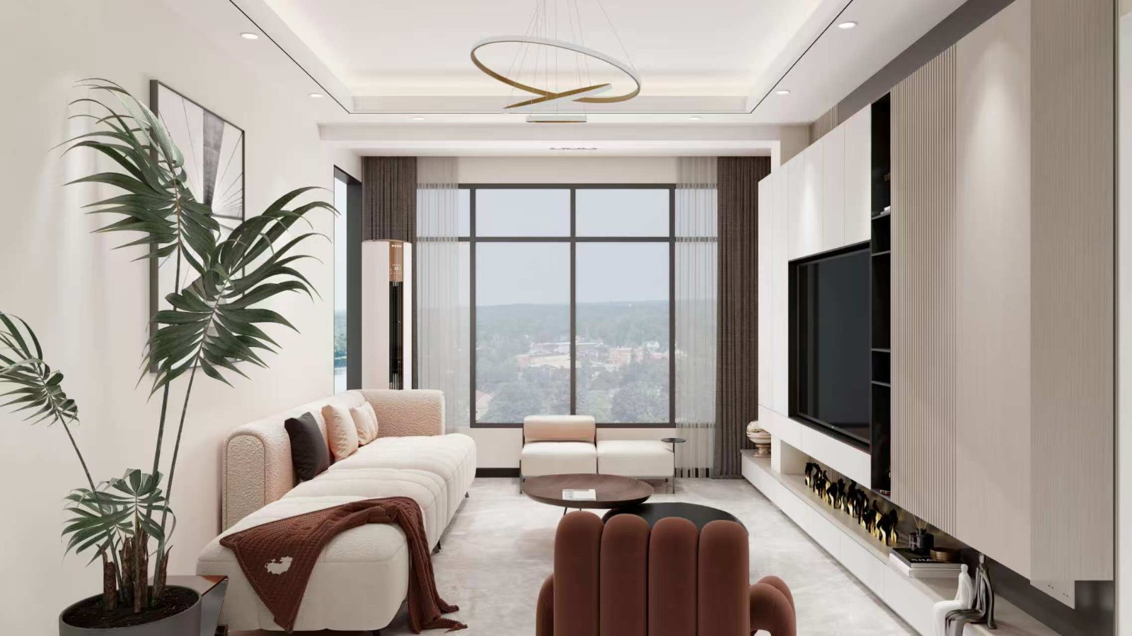 客餐厅用了奶白+暖棕的柔和配色,悬浮吊顶+环形吊灯提升精致感,定制电视柜还加了壁炉装饰,***感拉满;