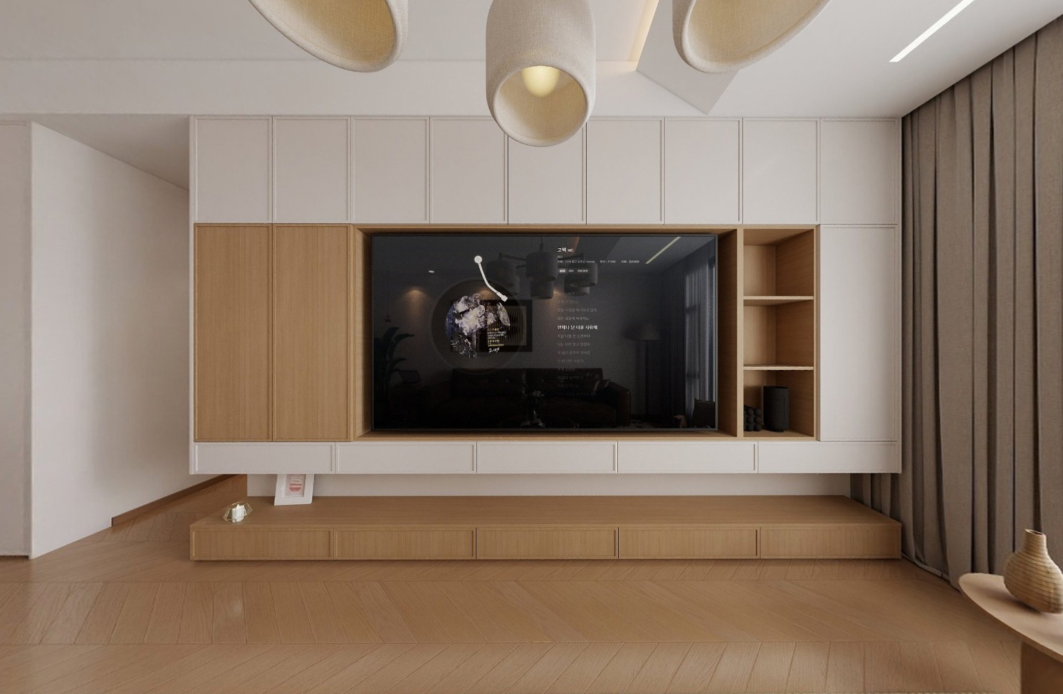 延续原木风简洁格调,浅木色与白色柜体融合,呈现大气收纳展示氛围。嵌入式电视与开放格陈列,平衡功能与美学,线性灯光勾勒空间层次,浅木色地台增加温馨感,构建兼具休闲、观景功能的家庭互动区。