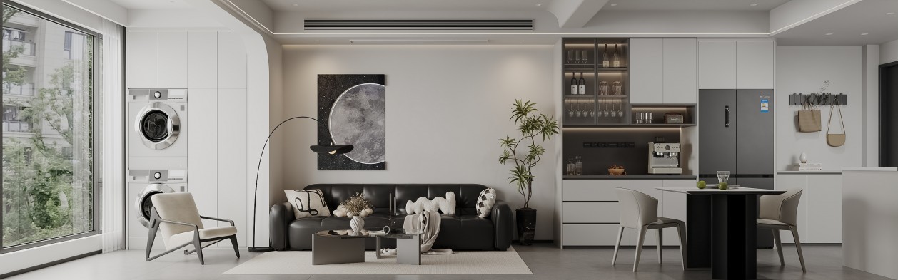 以黑、白、灰为主色调:这是黑白灰现代简约风格最显著的特点。这三种颜色搭配在一起,能够营造出一种简洁、大气、时尚的空间氛围。