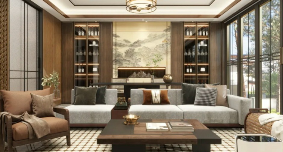 棕木柜嵌山水饰画,灰沙发搭褐调软装,格砖地 + 宫灯,禅意中式氛围里显舒适质感。
