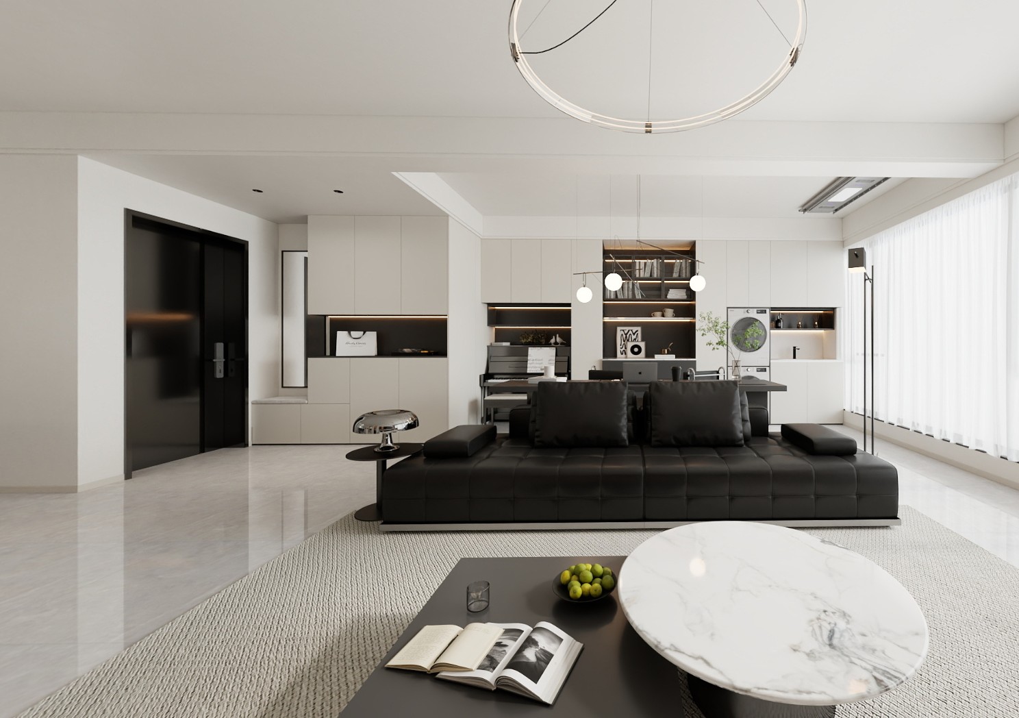 简洁的墙面和天花以一致的色系强化挑高空间的视觉张力,增强空间的多重感官体验,结构柱通过圆弧修饰,与天花相互衔接,仿佛是由此生长,而不刻意彰显。