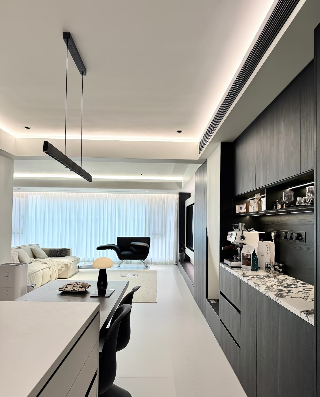 整体以黑白灰为主,加以无主灯设计