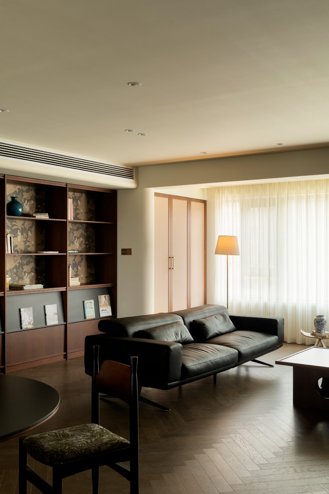 客厅定制同色系书架墙与电视墙,纱帘过滤后的柔和阳光浸润木质,营造出屋主喜爱的复古书香氛围。