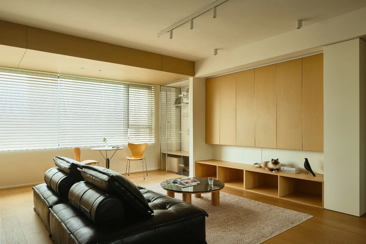 隐形收纳与场景切换在此完美融合:日常是一整面木色柜体,把杂物悄悄藏进秩序感里,让空间保持极简的清爽;