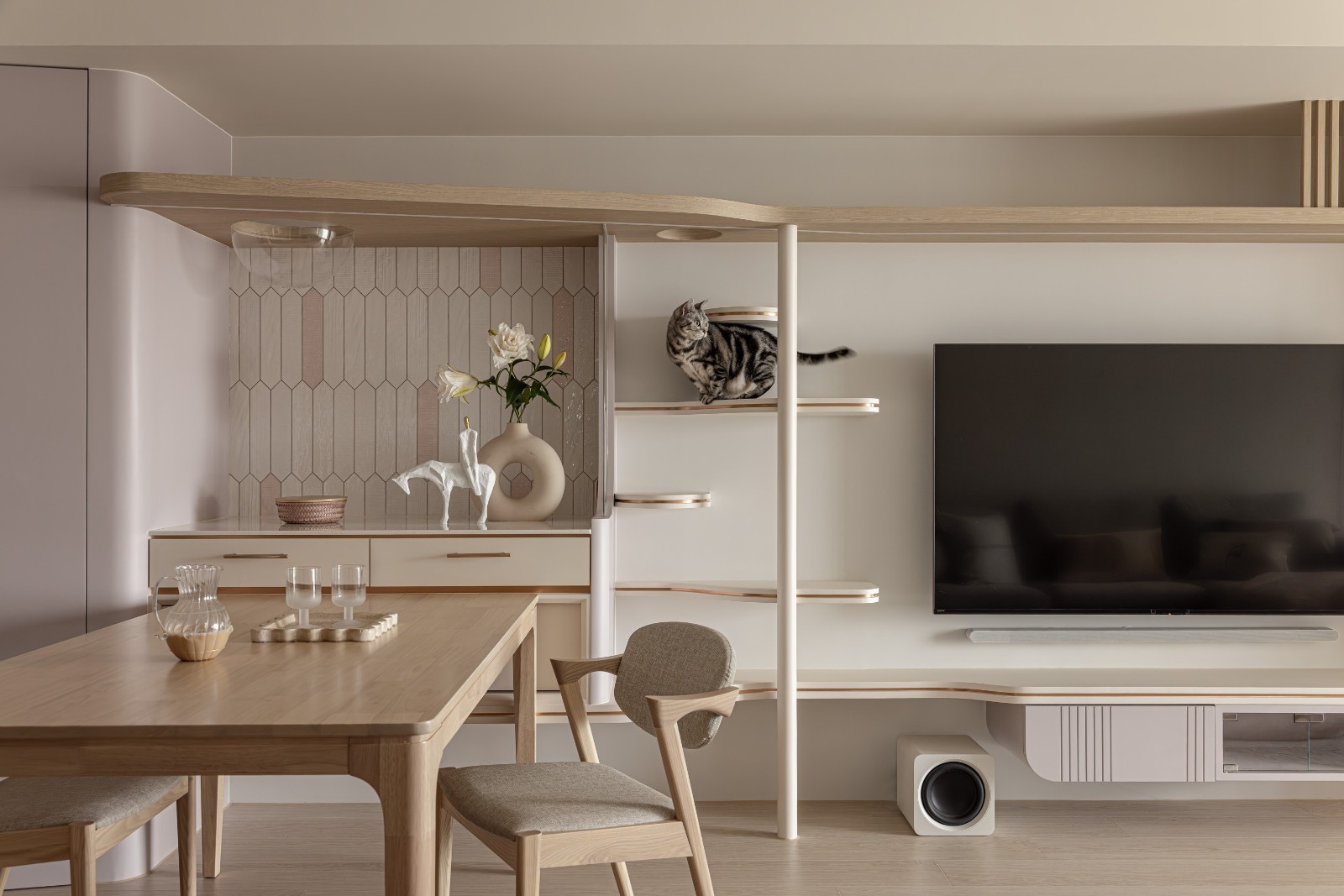 这套设计打破传统客餐厅的硬质分区,以弧形木作 + 通透层架作为空间过渡,同时嵌入「猫步动线」(墙面悬浮层架、柜内猫爬通道),让居住者与宠物的活动动线自然融合,实现 “美观与实用的双向兼容”。