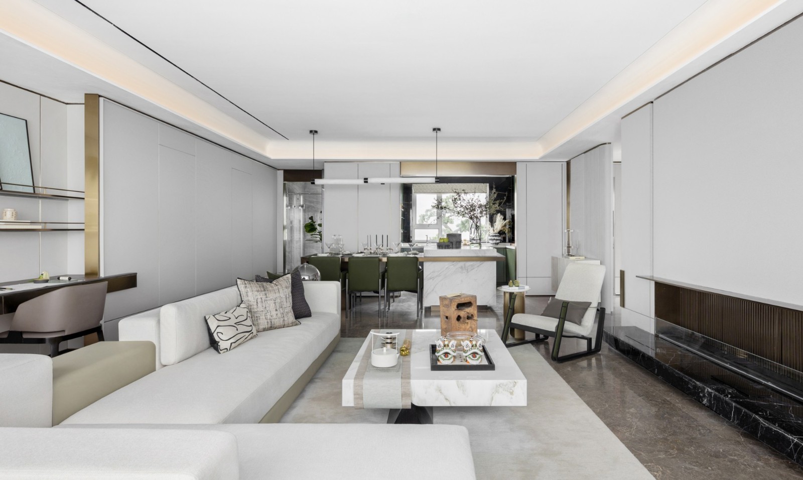 餐厅延续整体的现代简约框架,黑色大理石餐桌搭配金纹肌理,与墨绿皮质餐椅形成冷暖对比,利落又不失优雅。线性吊灯的极简设计与餐台的精致餐具、花艺相呼应,一旁开放式的墨绿色厨房柜体,成为空间中的色彩亮点,让用餐场景兼具实用性与视觉美感。