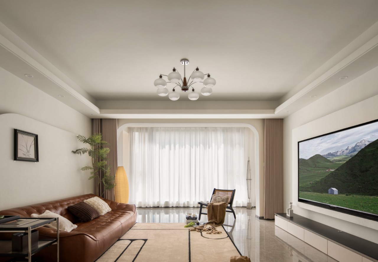 电视墙一侧选择了同样的弧形造型,与沙发背景、阳台垭口形成呼应,内嵌电视形成天然的画框,满足基础功能需求的同时也起到了很好的装饰作用,落地电视柜补充收纳,也让空间色调更加丰富。